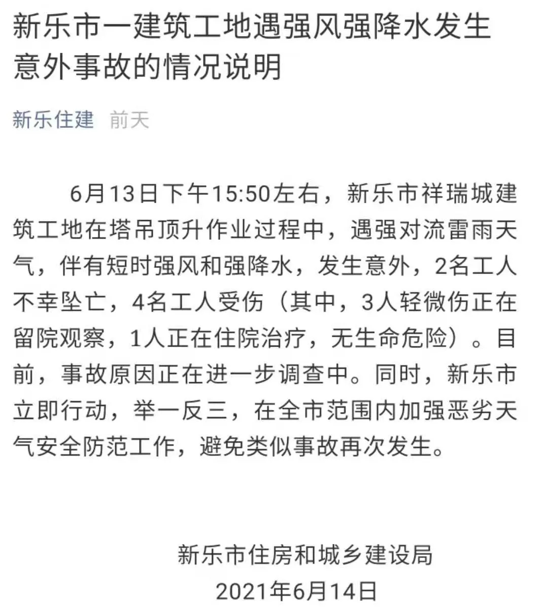 新樂(lè)住建消息,2021年6月13日下午15:50左右,石家莊新樂(lè)市祥瑞城建筑工地在塔吊頂升作業(yè)過(guò)程中,遇強(qiáng)對(duì)流雷雨天氣,2名工人不幸墜亡,4名工人受傷。目前,事故原因正在進(jìn)一步調(diào)查中。