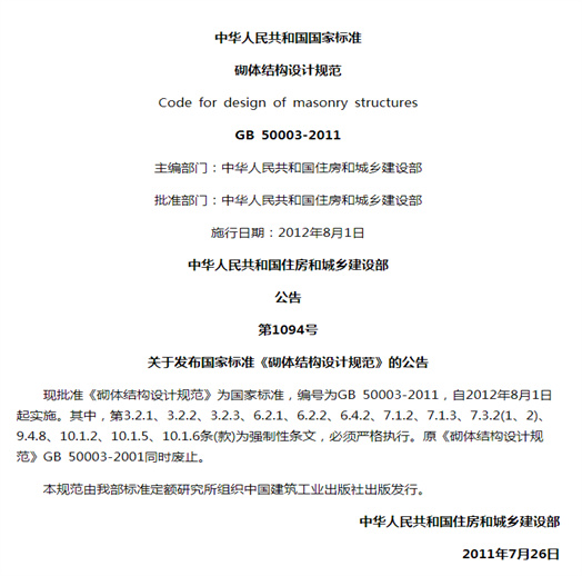本規(guī)范共分10章和4個(gè)附錄,主要技術(shù)內(nèi)容包括:總則,術(shù)語和符號(hào),材料,基本設(shè)計(jì)規(guī)定,無筋砌體構(gòu)件,構(gòu)造要求,圈梁、過梁、墻梁及挑梁,配筋磚砌體構(gòu)件,配筋砌塊砌體構(gòu)件,砌體結(jié)構(gòu)構(gòu)件抗震設(shè)計(jì)等。