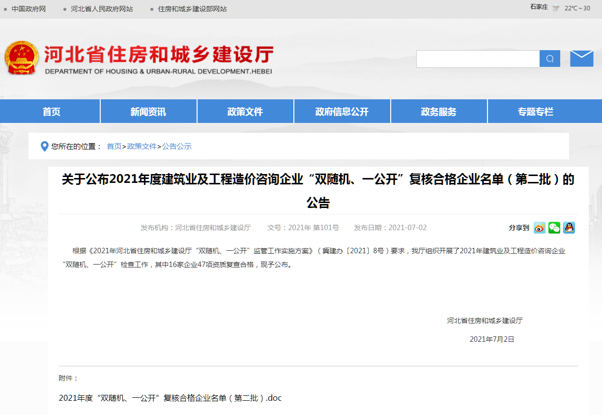 根據《2021年河北省住房和城鄉建設廳“雙隨機、一公開”監管工作實施方案》(冀建辦〔2021〕8號)要求,我廳組織開展了2021年建筑業及工程造價咨詢企業“雙隨機、一公開”檢查工作,其中16家企業47項資質復查合格,現予公布。