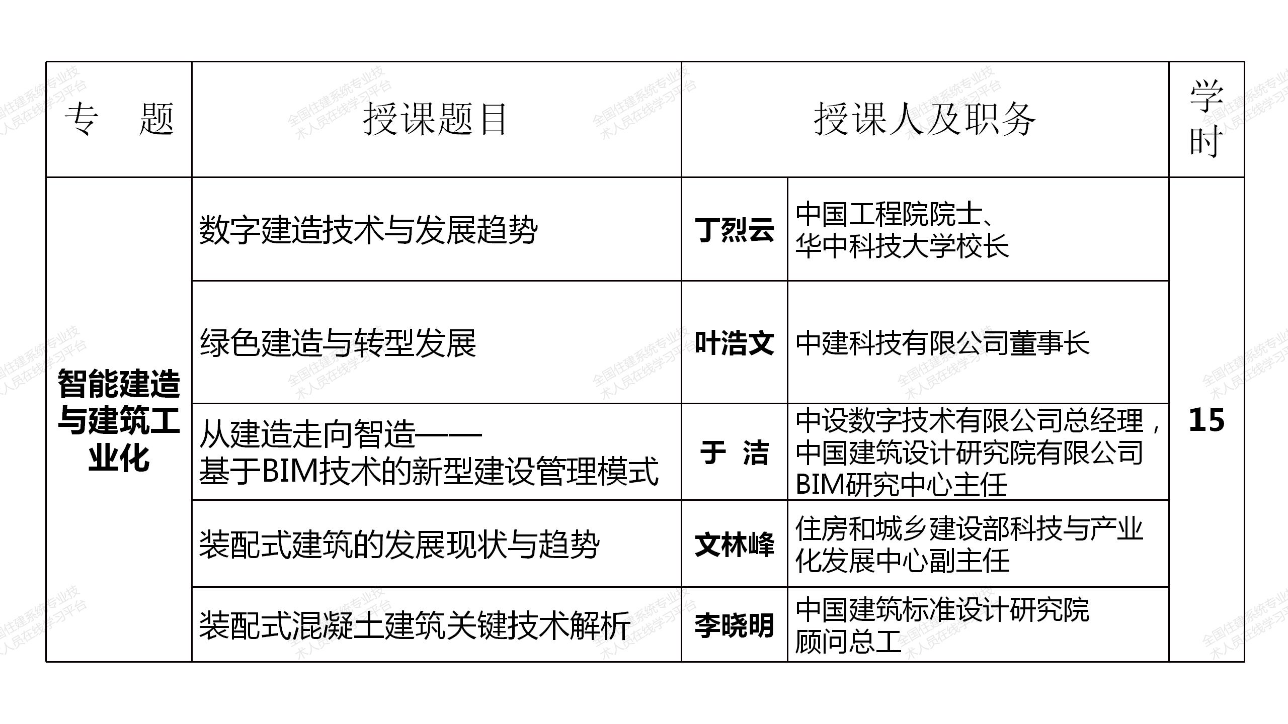 網絡選修課程由中國工程院院士、全國工程勘察設計大師和建筑領域著名專家、住房和城鄉建設部有關領導主講,分政策解讀、城市設計與城市品質提升、建筑創新與文化傳承、綠色建筑與建筑節能、智能建造與建筑工業化和建筑防火設計6個專題共85學時(見附表),注冊建筑師可根據自身需要選擇其中40學時學習,其中10學時的政策解讀專題課程免費提供,并可計入繼續教育學時。課程緊密結合國務院、住房和城鄉建設部近年發布的有關行業改革、裝配式建筑、建筑工業化、智能建造等重大政策,緊跟國家形勢發展需要,是一套集權威性、系統性、針對性、實效性于一體的建筑領域頂尖課程。選修課程于2021年7月12日在“全國住建系統專業技術人員在線學習平臺”(http://www.mayortraining.net)正式上線。
