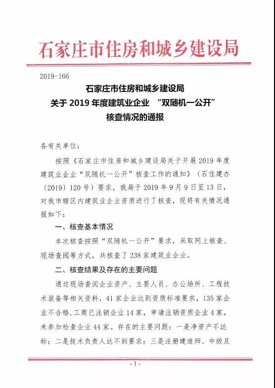 本次共核查了238家建筑業(yè)企業(yè),其中,41家達(dá)到資質(zhì)標(biāo)準(zhǔn)要求,197家不合格(含工商已注銷企業(yè)14家,申請(qǐng)注銷資質(zhì)企業(yè)4家,未參加檢查企業(yè)44家)。